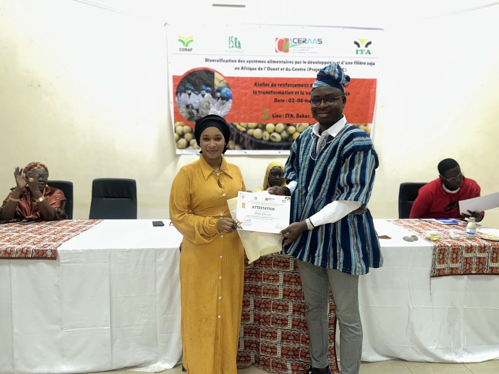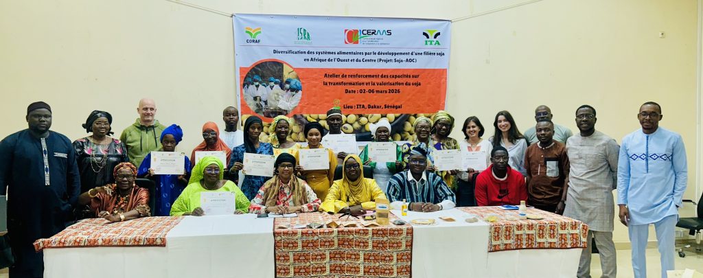 Dans le cadre du programme régional Soja-AOC (Diversification des systèmes alimentaires par le développement d’une filière soja en Afrique de l’Ouest et du Centre), piloté par ISRA-CERAAS avec l’appui financier de la Banque mondiale et du CORAF, le Sénégal franchit une étape décisive dans la structuration de sa filière soja.Du 2 au 6 mars 2026, la cuisine expérimentale de l’Institut de Technologie Alimentaire (ITA) a accueilli un atelier pratique de transformation du soja, destiné aux jeunes et aux femmes transformatrices. Cette formation participative vise à :